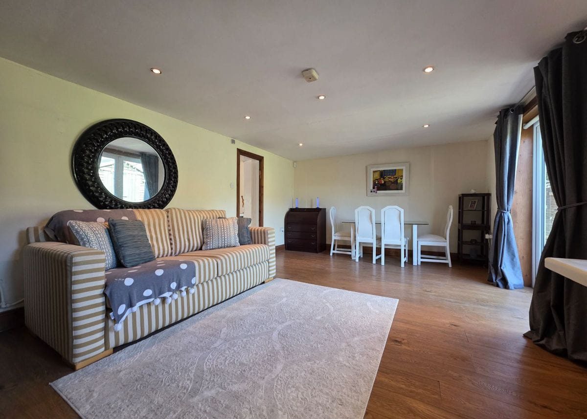 Living/Dining Quarters: Approx 5.92m x 3.92 This is a really impressive space with ample space for a large dining table and chairs and sofas. It offers double door access to the impressive back garden, with wood effect floor.