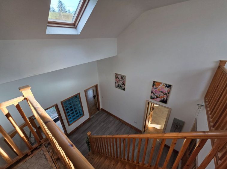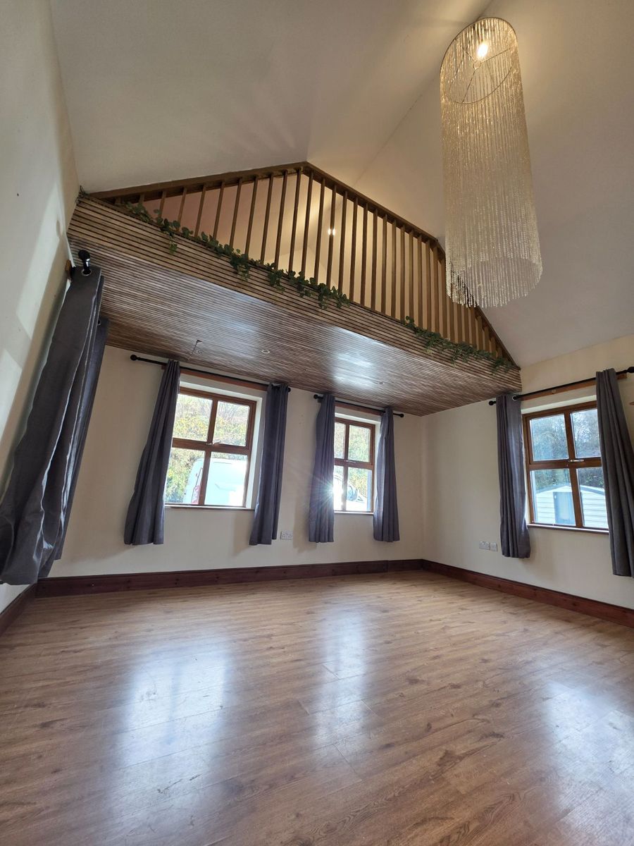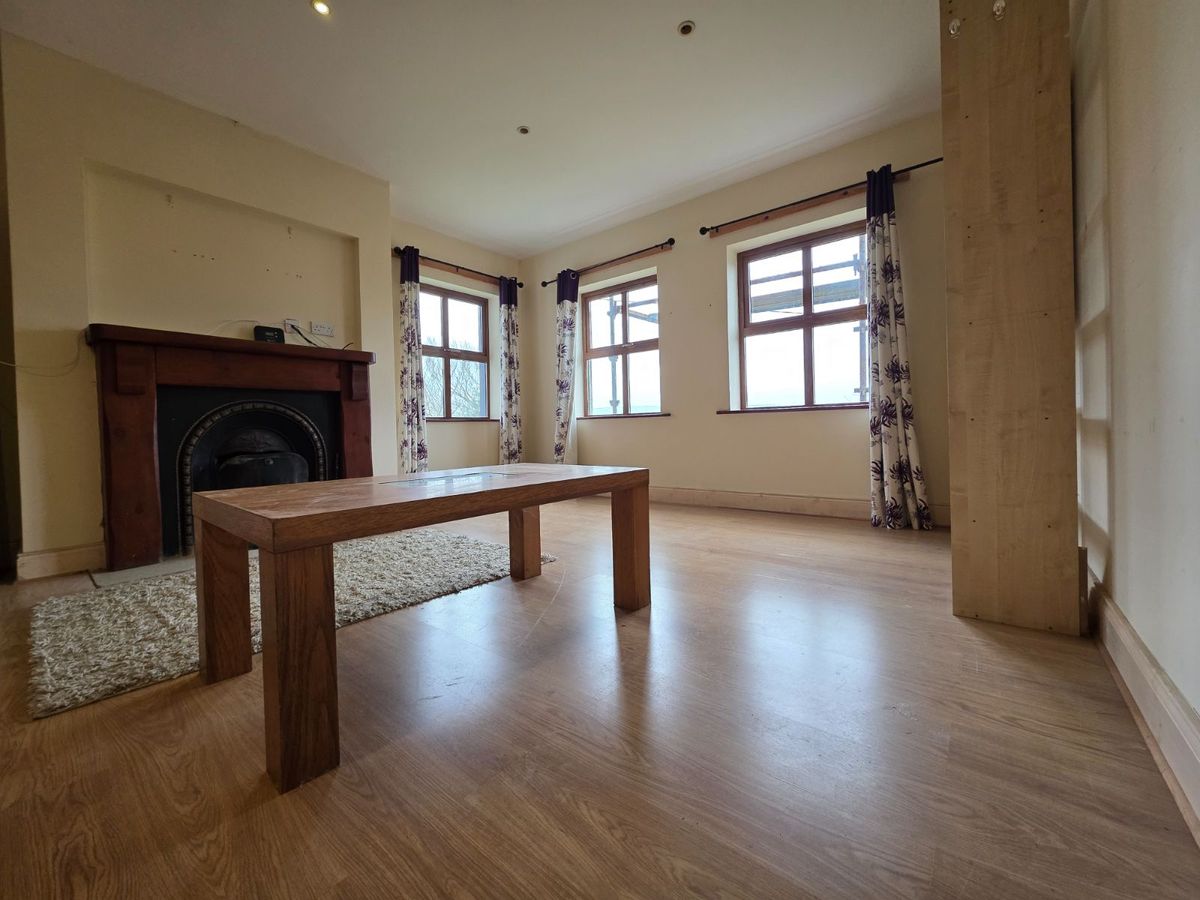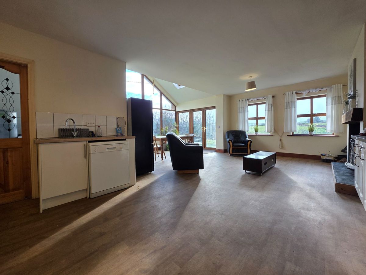Kitchen/Dining/Living Quarters. What a space this is! Striking features include double height ceilings in part and large widows which result in a naturally bright space. Offers direct access to the back garden area with views out to the rolling hills. Complete with ample storage units, feature fireplace with stove and wooden mantle piece, sink, cooker and plumbed for dishwasher.