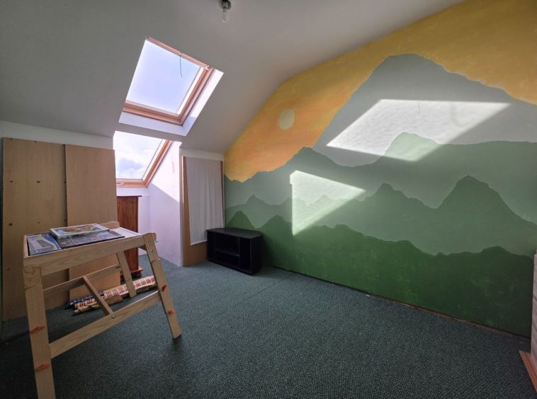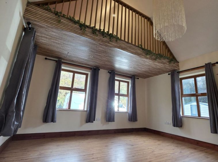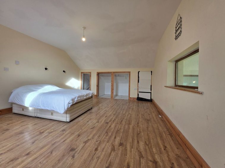 Bedroom 3/Playroom/Office. With its very own mezzanine this is a unique room. Will easily accommodate a Super king bed, with extra high lofted ceiling. Mezzanine is accessed through drop